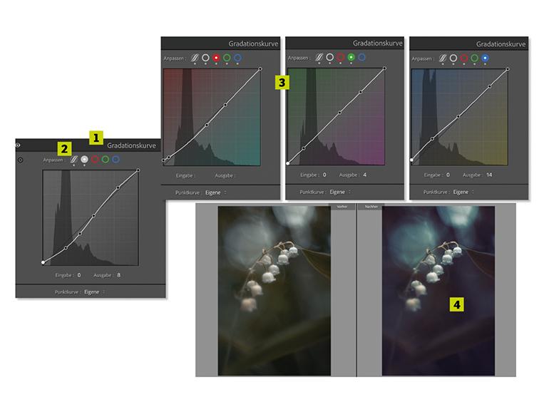 Für die finale Anpassung gehen Sie nochmals zurück zur Gradationskurve (1). Hier können Sie noch die Punktkurve (2) sowie die einzelnen Farbkanäle (3) bearbeiten. Auf diesem Wege kommen Sie zum endgültigen Bildergebnis von Christina (4).