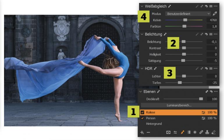 Der Hintergrund ist dennoch zu hell geblieben. Deaktivieren Sie wieder die Graustufenmaske mit Alt+M. Wählen Sie daher die Ebene Kulisse (1) aus und machen Sie Ihre Anpassungen im Register Belichtung, Sie können z. B. die Belichtung und Sättigung leicht reduzieren (2). Darüber hinaus reduzieren Sie die Tiefen im HDR-Werkzeug (3), damit der Hintergrund etwas dunkler wirkt. Auch beim Weißabgleich-Werkzeug (4) können Sie etwas nachjustieren, bis Ihnen die Farbstimmung des Hintergrunds gefällt. Im Beispiel können Sie diesen kühler machen.