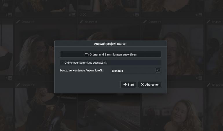 In der linken Palette aktivieren Sie oben den Button Auswahlprojekt. Hier wählen Sie im Dialogfenster die gerade angelegte Sammlung aus und klicken anschließend auf Start. Profi-Tipp: Über Auswahlprofil definieren Sie bereits in diesem Step, ob bspw. unscharfe Fotos direkt aussoriert werden sollen.