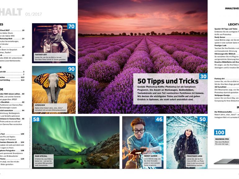 Auf insgesamt 14 Seiten stellen wir Ihnen 50 geniale Tipps und Kniffe vor, die Ihren Photoshop-Alltag leichter machen werden – hier findet sicher auch der fortgeschrittene Photoshopper noch eine neue Funktion. Oder wussten Sie schon, dass Photoshop auch Toast und heißen Kaffee zubereiten kann? In unserem Praxis-Ratgeber dreht sich anschließend alles um das Thema Raw. Erfahren Sie, wieso es sich lohnt, in diesem Format zu fotografieren, und wie Sie Ihre Bilder in Camera Raw optimieren.