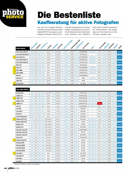 Die Bestenliste wird mit jeder Ausgabe aktualisiert. Hier finden Sie die Liste der Ausgabe 04/2014. Aufgelistet sind die jeweils besten DSLR-Kameras der Kategorien Profi, Semi-Profi und Einsteiger sowie die besten CSC-Kameras der gleichen Kategorien.