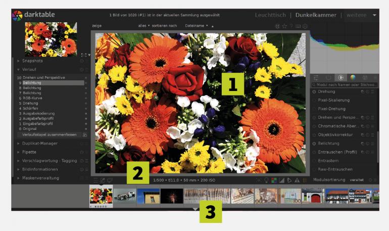 Sobald Sie ein Foto im Dunkelkammer-Modul geöffnet haben, wird es automatisch so in den Arbeitsbereich eingepasst, dass es vollständig zu sehen ist (1). Unter dem Bild werden die Aufnahmedaten (2) angezeigt. Unten sehen Sie den Filmstreifen (3). Wollen Sie ein anderes Bild bearbeiten, klicken Sie doppelt auf das …