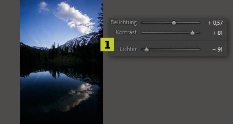 Da Tobias selten Filter beim Fotografieren benutzt, in diesem Fall auch keinen Grauverlaufsfilter, hat er das Foto absichtlich etwas unterbelichtet. So hat er den Himmel nicht zu hell und ausgebrannt aufgenommen und kann das Bild nachträglich in Lightroom leicht „retten“. Um das Foto aufzuhellen, beginnen Sie mit den Grundeinstellungen: Belichtung auf +57 und Kontrast auf +81 erhöhen, Lichter auf –91 reduzieren (1).