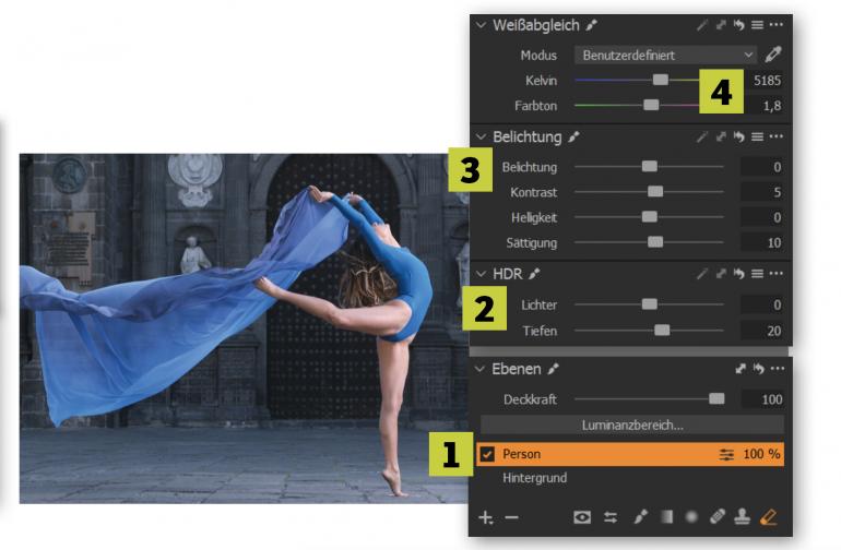 Um Anpassungen an der maskierten Person durchzuführen, wählen Sie diese Ebene aus (1). Das Häkchen muss dabei aktiviert sein. Deaktivieren Sie gegebenenfalls die Graustufenmaske mit Alt+M. Jetzt können Sie Anpassungen vornehmen. Bei unserem Beispielbild ziehen Sie im Register HDR (2) die Tiefen sowie die Sättigung und den Kontrast bei Belichtung (3) etwas hoch. Fügen Sie auch über das Weißabgleich-Werkzeug einen wärmeren Farbton (4) hinzu. Ein Anheben der Klarheit gibt der Person den letzten Schliff.