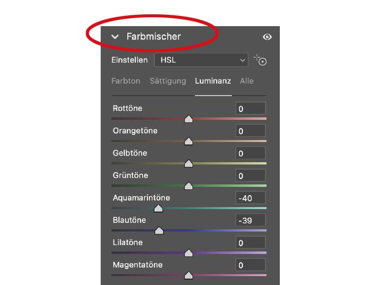 Da wir das Bild aufgehellt haben, reduzieren wir die Luminanz der Blau- und Cyantöne, um dem Himmel ein wenig mehr Intensität zu verleihen. Wie man sieht, gehen die globalen Korrekturen in die richtige Richtung, liefern aber nicht das finale Ergebnis.