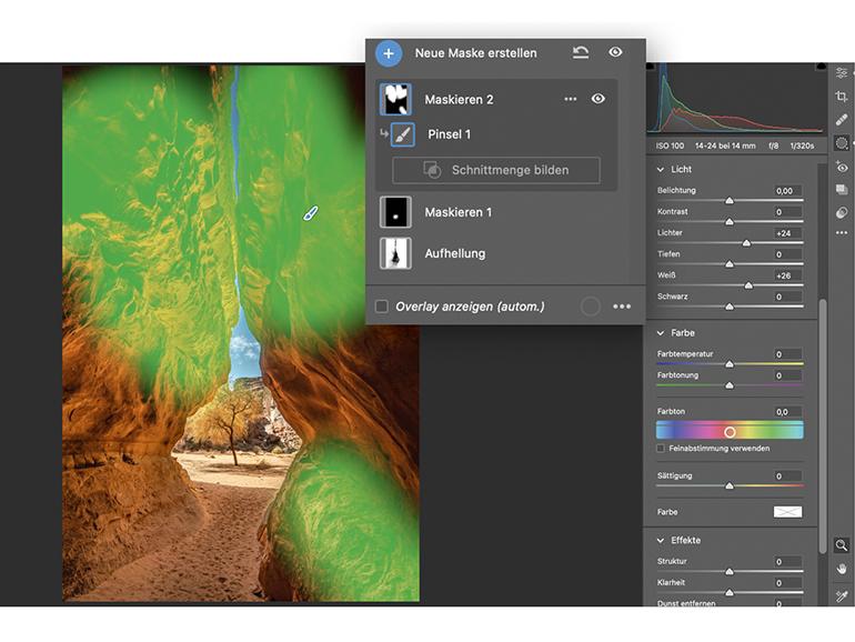 Ein unsauberes Arbeiten lässt das Foto sofort künstlich und minderwertig aussehen. Für die selektiven Korrekturen nutzen wir die Maskieren-Funktion in Camera Raw, die aber genauso in Lightroom oder Lightroom Classic nachvollzogen werden kann. Zur Veranschaulichung ist die Maskierung grün eingefärbt.