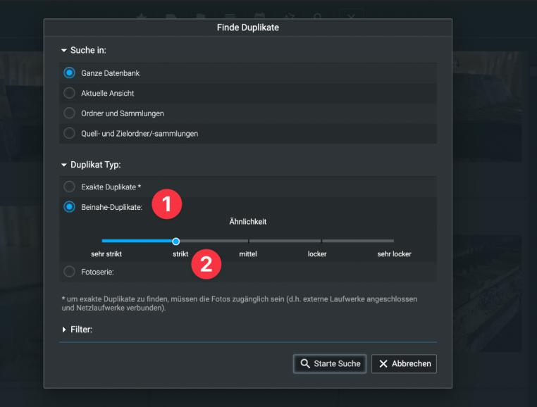 Starten Sie erneut mit dem Duplikatefinder. Im Bereich Filter wählen Sie Beinahe-Duplikate (1) an. Bei der Ähnlichkeit legen Sie mittels Schieberegler fest, wie genau es Excire Foto nehmen soll. Wir entscheiden uns hier für strikt (2) und starten die Suche. Klicken Sie im folgenden Dialogfeld direkt auf Flaggen-Assistent öffnen.