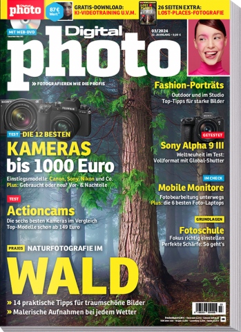 So gelingen malerische Aufnahmen im Wald – mit ganz vielen Praxis- und Profitipps. Außerdem stellen wir Ihnen die 12 derzeit besten Kameras für unter 1000 Euro vor. Und wir testen die Profi-Kamera Alpha 9 III – mit ihrem ultra-schnellen Global-Shutter-Bildsensor. Auch Laptops für Fotografinnen und Fotografen haben wir im Heft, sowie portable Monitore! Unsere Mitmachworkshops behandeln u. a. die Generative Erweiterung („GenExpand“) mit Luminar Neo – damit können Sie ihre Fotos nachträglich erweitern, falls der Bildausschnitt mal zu klein war. Das alles u. v. m. lesen Sie in der DigitalPHOTO 03/2024.