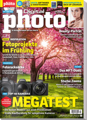 In der neuen DigitalPHOTO-Ausgabe 05/2022 stellen wir unser neues Testverfahren vor und haben direkt 40 Top spiegellose Kameras im Megatest. Außerdem im Heft: Speicherkarten und Speicherlösungen, Fotobücher für die Hochzeit, Fotorucksäcke, Bildbearbeitungs-Tipps von Pavel und Miho u. v. m. Megatest: 40 Top spiegellose Kameras Fotorucksäcke für Stadt und Natur Speicherkarten und Backup-Lösungen Bildbearbeitung mit Pavel & Miho Fotoprojekte im Frühling