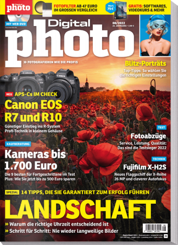 Lust auf Landschaftsfotos? In der neuen DigitalPHOTO-Ausgabe 08/2022 liefern wir Top-Tipps mit denen Sie Ihre Bilder garantiert verbessern. Plus: Großer Filtertest und Kamera-Kaufberatung. Landschaftsfotografie verbessern Canon EOS R7 & EOS R10 Fotofilter ab 47 Euro Lightroom-Bildbearbeitung Kameras ab 1.700 Euro