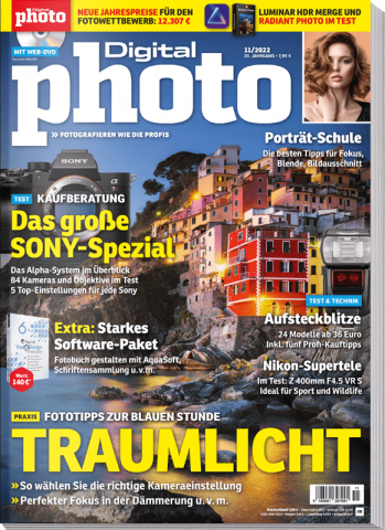 In der neuen DigitalPHOTO 11/2022 erklären unsere Tipps, wie Sie Motive in der Dämmerung perfekt einfangen. Außerdem im Magazin: das Sony-Portfolio im großen Überblick Traumlicht: Blaue Stunde Sony-Portfolio im Überblick Marktübersicht: Aufsteckblitze Neue Software HDR Merge und Radiant Photo