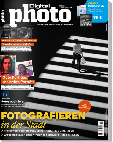 In der DigitalPHOTO 11/2025 nehmen wir Sie mit auf eine Fototour durch die Stadt. Häufig werden Städtetrips fotografisch reduziert auf die touristischen Hauptattraktionen. Dabei verstecken sich die wirklich spannenden Motive meist abseits des Trubels. In unserem Spezial geben wir Ihnen jede Menge Motivideen an die Hand und erklären zudem, worauf Sie beim Fotografieren unbedingt achten sollten. Wir haben außerdem Fotoleinwände von acht Druckdienstleistern im Internet getestet. Dabei gab es zwischen den Anbietern riesige Preisunterschiede. Ob sich das auch in der Qualität widerschlägt? Wir liefern die Ergebnisse.