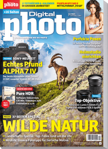 Wir haben die wilde Natur im Heft! Lesen Sie über schroffe Landschaftsmotive, Wildtiere oder Genre-Tipps zur Bildgestaltung. Daneben gibt es die Vorstellung der Sony Alpha IV und der Fujifilm GFX 50S II sowie umfangreiche Ratgeber u.a. zur Porträtfotografie und zur Heimstudio-Einrichtung. Sony Alpha IV Wilde Natur Ratgeber Porträtfotografie Heimstudio einrichten